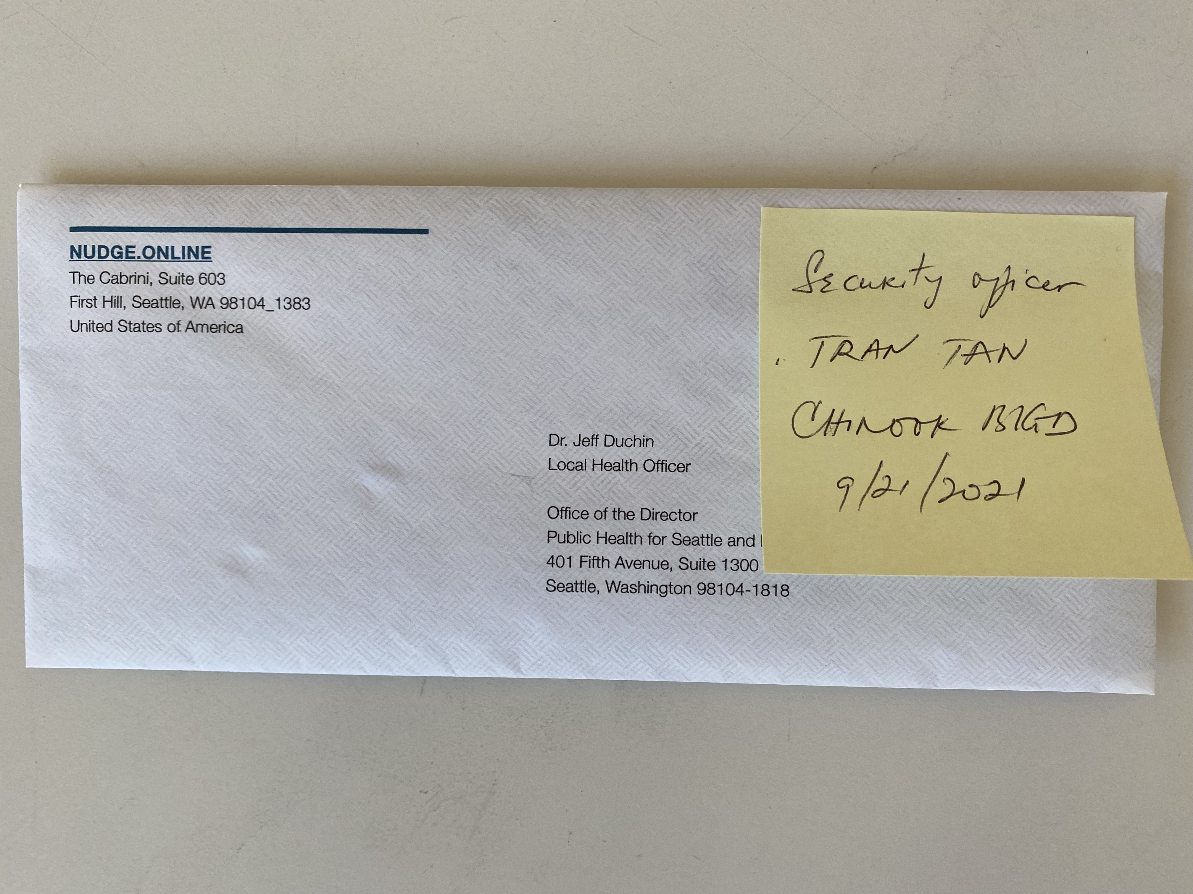 The official made a call, and I was told that I could send my letter to the same address whose fax number had previously failed. So, I requested that the individual come down to the lobby to receive the letter. Whereupon I was told to leave the letter at the desk, and it would be delivered. Someone would descend later to pick it up. Mind you, the Office of Public Health for Seattle and King County is a government office that is suppose to serve the general public.