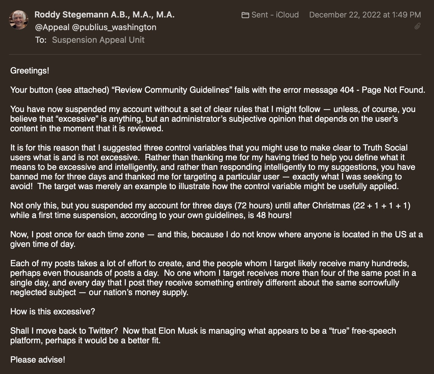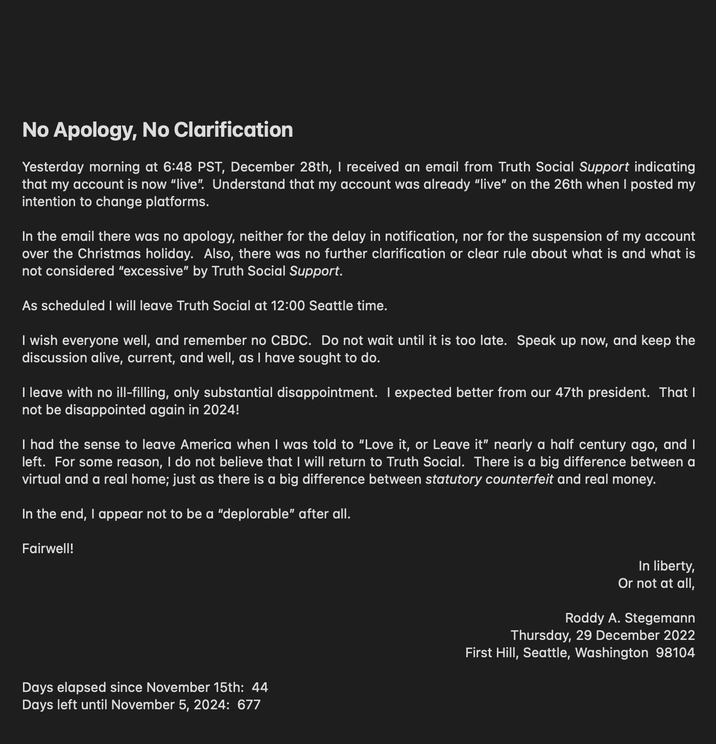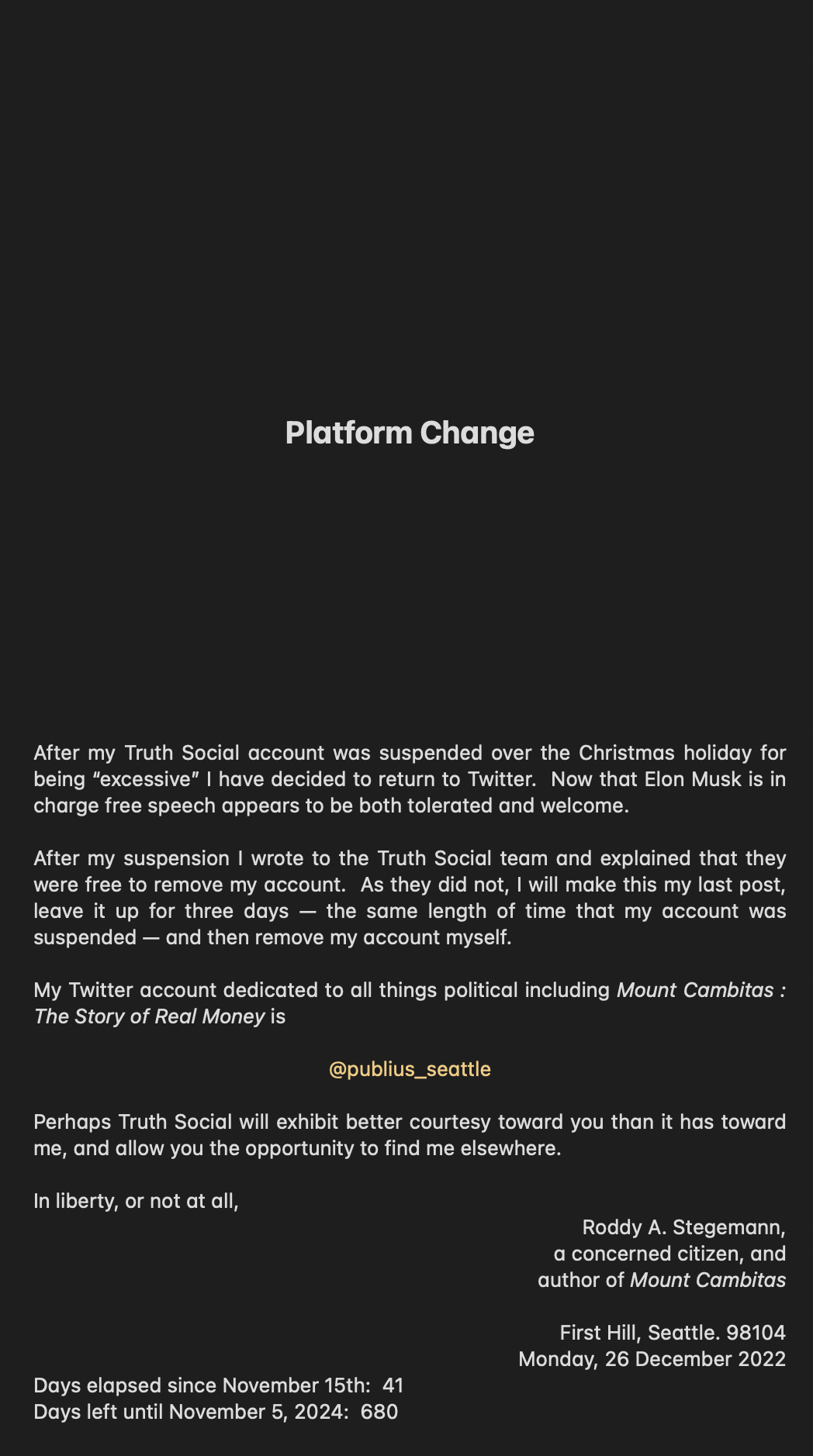 So, I decided to speak up and write an article about what I knew to be the truth about statutory counterfeit, gold, and cryptocurrency. Indeed, all three were poorly represented by each of their respective advocates, and it was time that someone make the case for real money -- still again -- and view the matter from perhaps a different, more easily understood lens. The article was to appear in a series of Twitter posts that could be shared with everyone.
