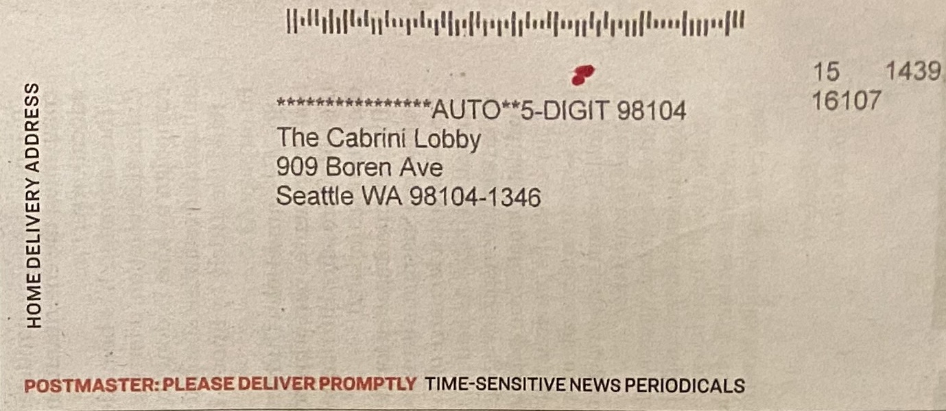For the first two weeks the paper did not appear. It was delivered to the lobby of a neighboring office building that shares the name Cabrini. I know this because I paid a trip to the building's front desk and asked, if they had been receiving the paper. Several telephone calls to the US Postal Service later, I was told that the mailman who serviced both our buildings would be notified about the proper place to deliver the paper. I never learned what brought about the confusion. Perhaps it was the last digit of the zip code? It should have read 98104-1383, rather than 98104-1386. This said, the street number was clearly 909 and different from that of the building next door. No matter, on Friday of the third week it arrived on schedule on the table in the lobby of Cabrini Senior Housing. Hooray! Hooray!