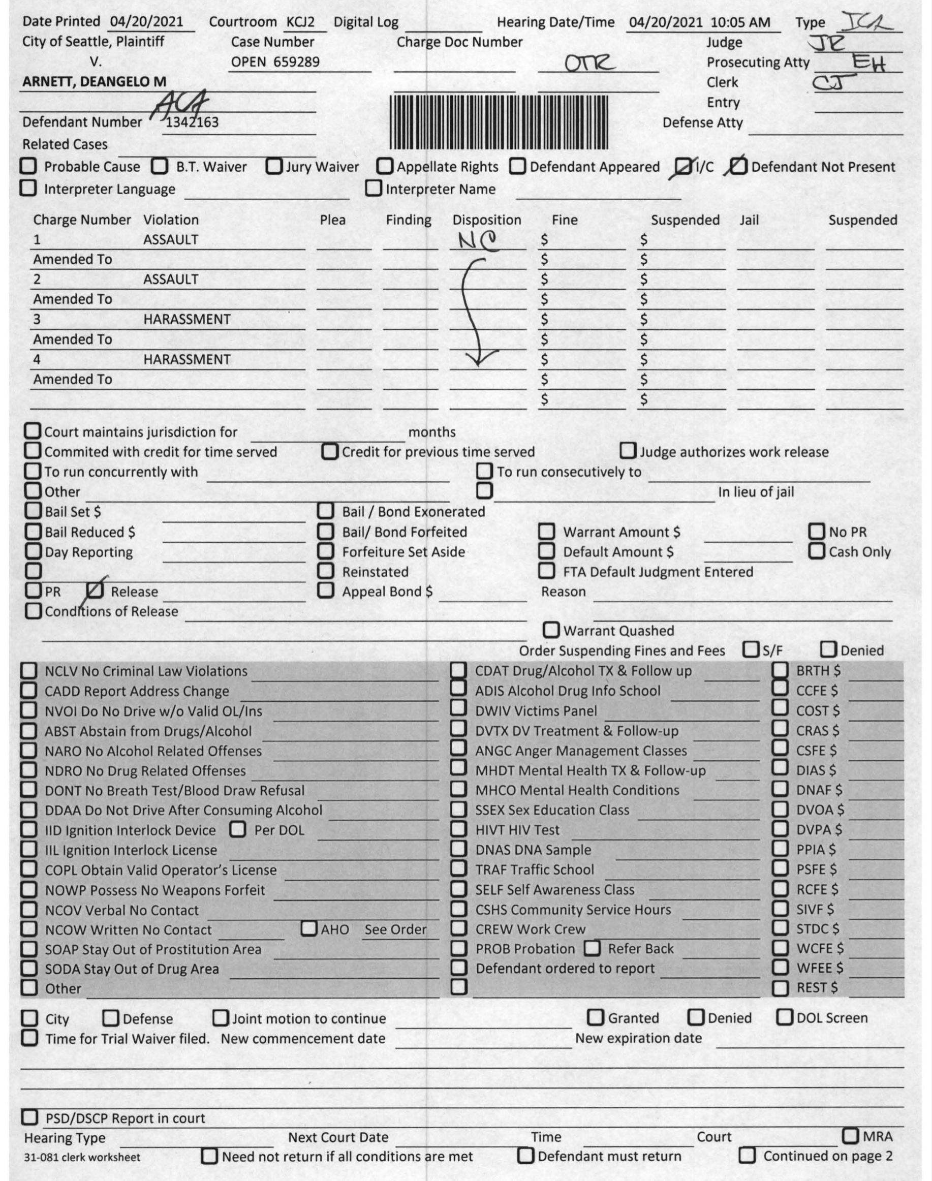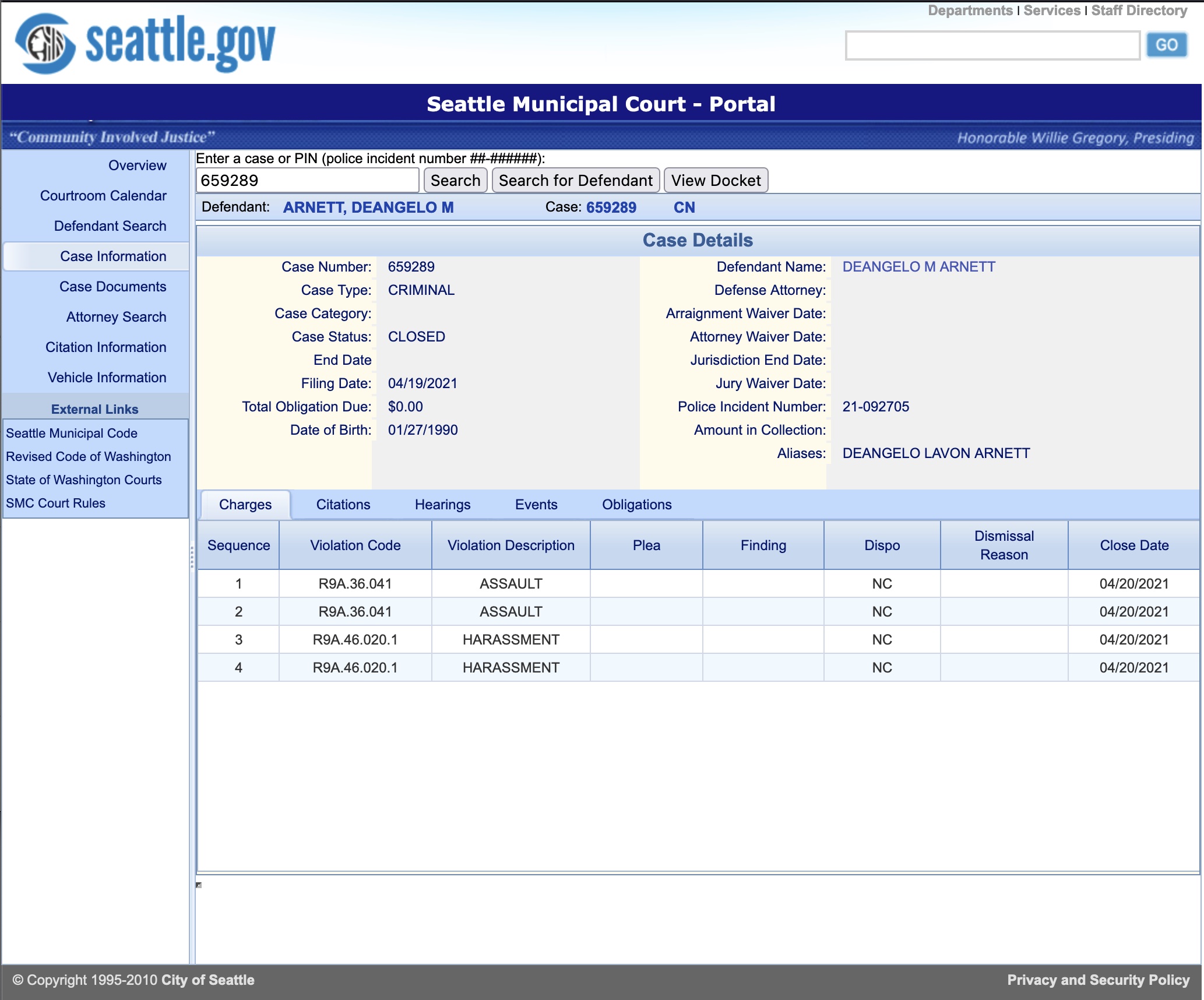 1) jailed,Whereupon I sent him a copy of a public record that I found at the Seattle Municipal Court online portal (see image).