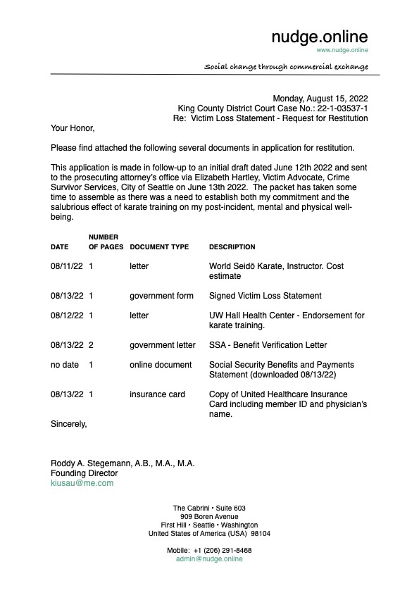 The formatting of video data resulted in another long week of back and forth between the good detective and me, but we had created by this time a solid online working relationship, and I was confident that my assailant would have his day in court. I had only to insure the detective that I was not wasting his time, and that I would follow through in court.