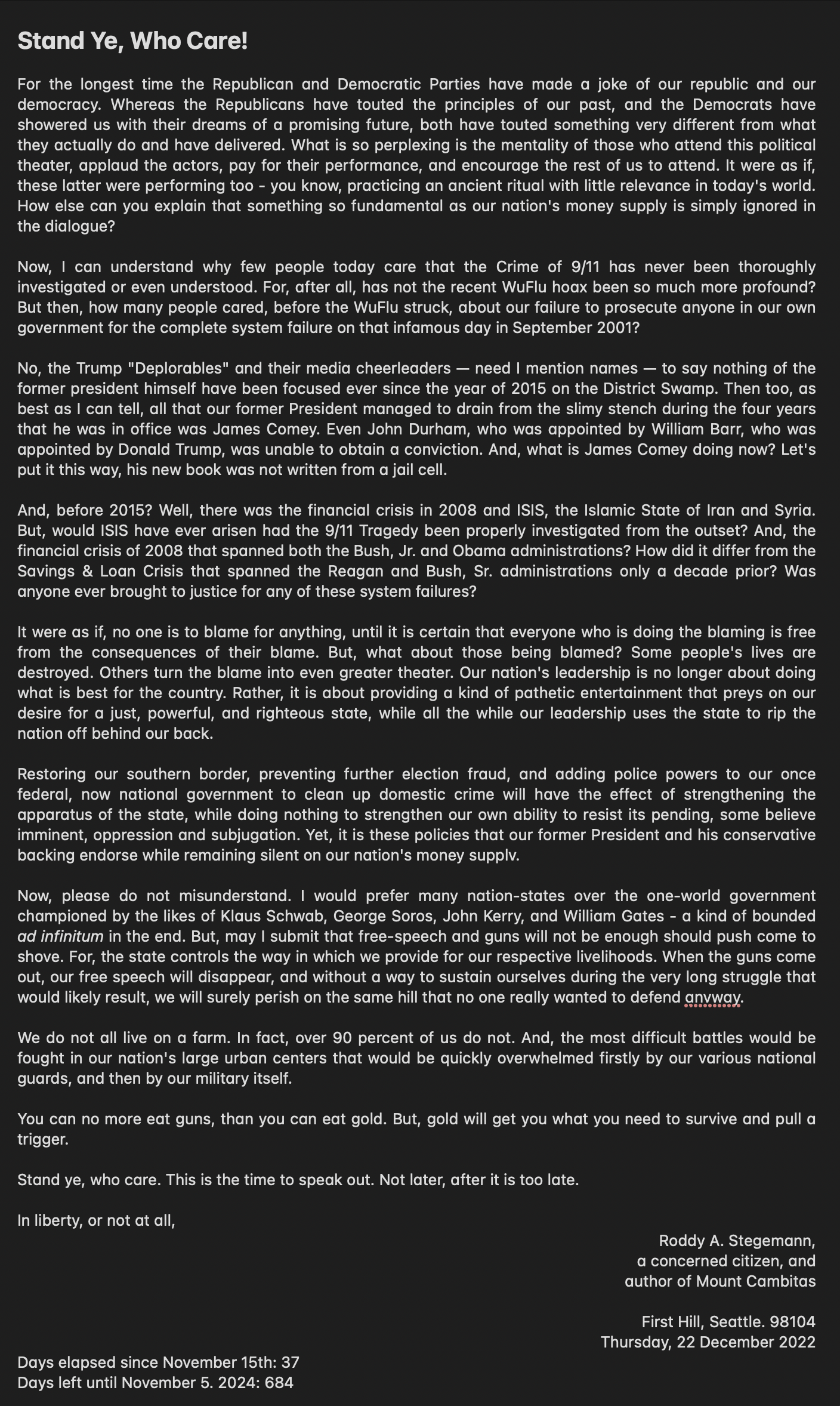 It was a pretty awkward beginning, because I forced the few followers that I had gathered on Twitter to change platforms and move to Substack. Further, new subscribers that discovered me on Substack would have to be provided with what the others had already read. What is more, Substack had no facility whereby a newcomer could start at the beginning of the book and receive daily updates from that point on. In effect, the only daily updates were those that I provided on the day that they were provided, and these were always a new page in the book. Between September and the end of December some ninety pages had been written, and this was a lot of material to have to read online in order to catch up.