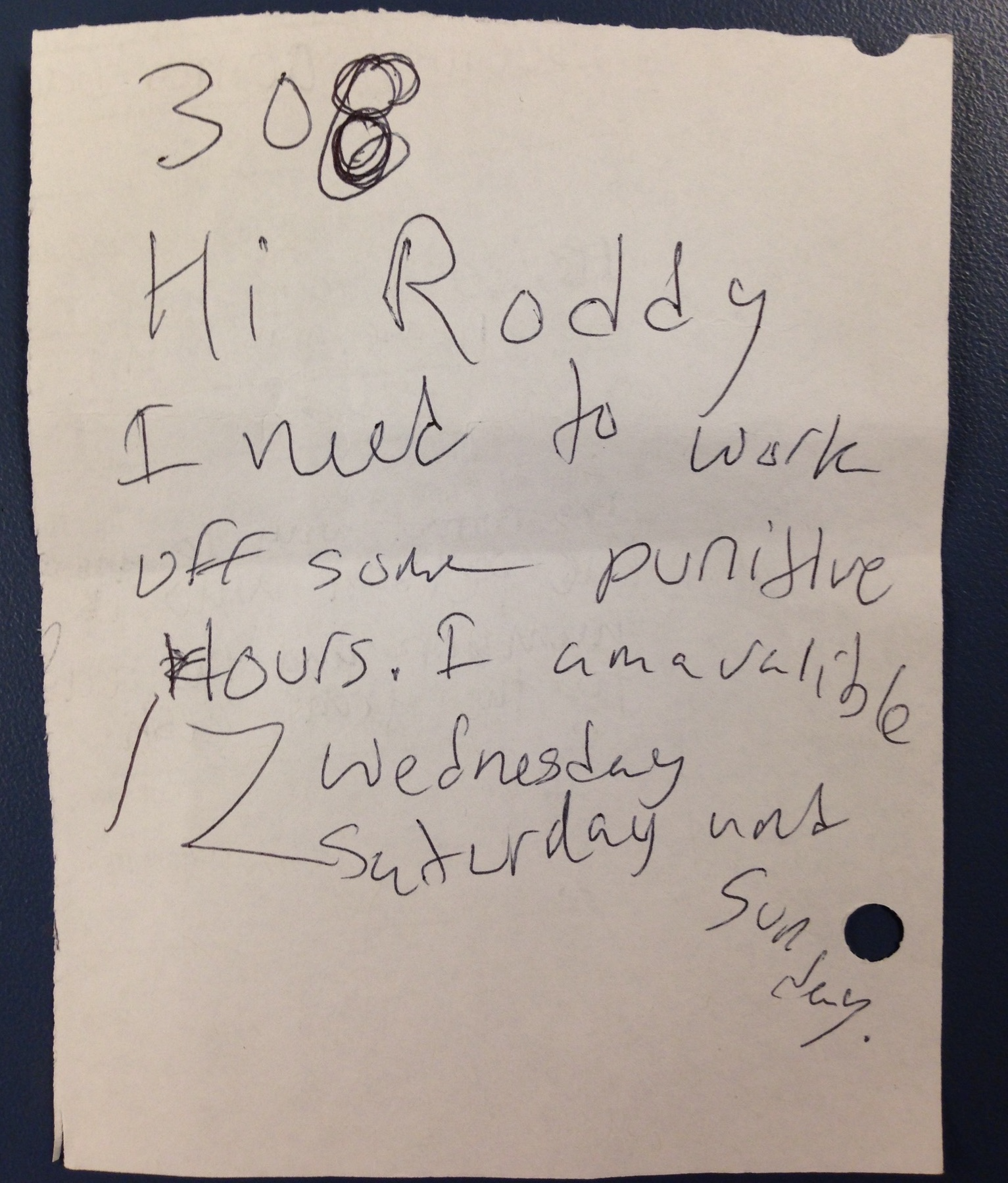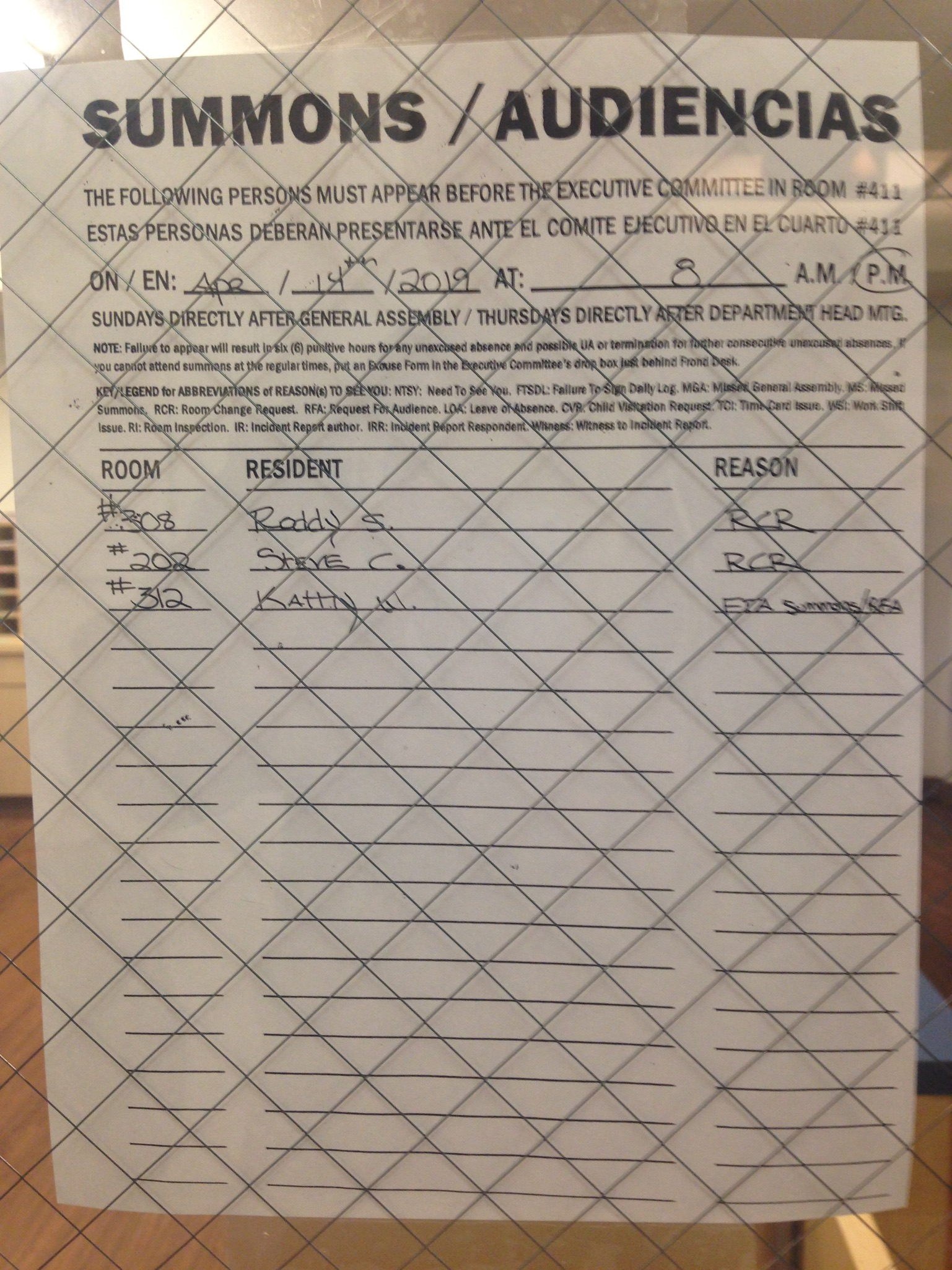 Unlike a shelter where you spend the night with barely a trace of your having been on the following day, at the Inn you are under constant surveillance by other residents who stand ready to write you up for any perceived slight, and who have the ability to drag you before the Executive Committee -- a group of privileged residents who obtain their post in regularly scheduled "sloppy" elections in which one is nominated, seconded and then voted into office with neither debate, nor discussion. As these elections are largely popularity contests of the moment that often depend on who is already seated on the committee, they often result in the absence of any contest at all. Thus, the quality of those seated on the committee is generally poor. The content of the incident reports that result from this system of democratic arbitrage are highly personal in nature, generally contrived, and often creative and sometimes even well-written given the education level of most of the Inn's members. I suspect that much of the content comes from the frequently watched films, reality shows, and relentless gossip that are the staple of entertainment of most of the Inn's residents.
