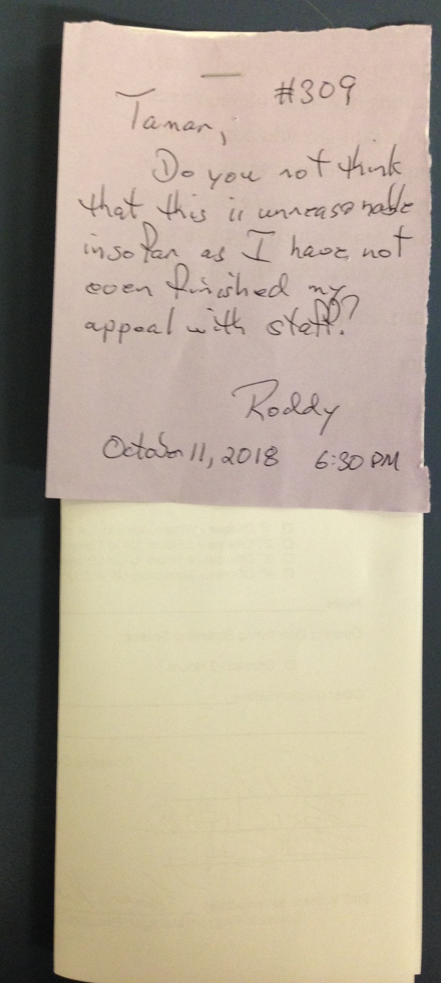 The nine-month break from the weight room, my physical therapy, and my new lodging had greatly changed my gym habits, and for better or for worse I fear that I will never be the same. Before my hunger strike in 2016 I was pressing more than two 45-pound plates on either side of a 45-pound barbell. During the three years that I was homeless I could not return to that level. And, now this. Only time will tell. Another story for next year's annual report.