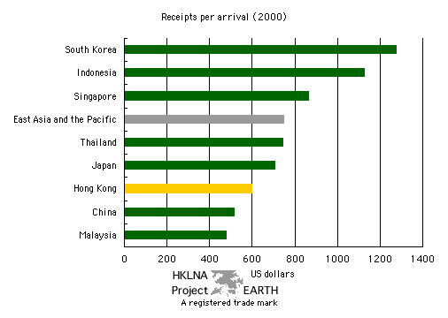 | Note: Hong Kong's poor performance may be brought about by a large number of pass-throughs on their way to China, or alternatively on their way from China to other overseas locations. In either case they spend little time and money and do not require a large number of Hong Kong citizens to service their tourist needs. | |