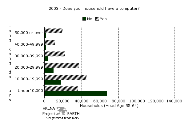| Source: Hong Kong Government. Census and Statistics Department. Social Surveys Section. 2003. Thematic Household Survey. Information Technology Usage and Penetration. Data obtained by special request from the Social Surveys Section. EARTH's copy of the corresponding table is available on request. |
